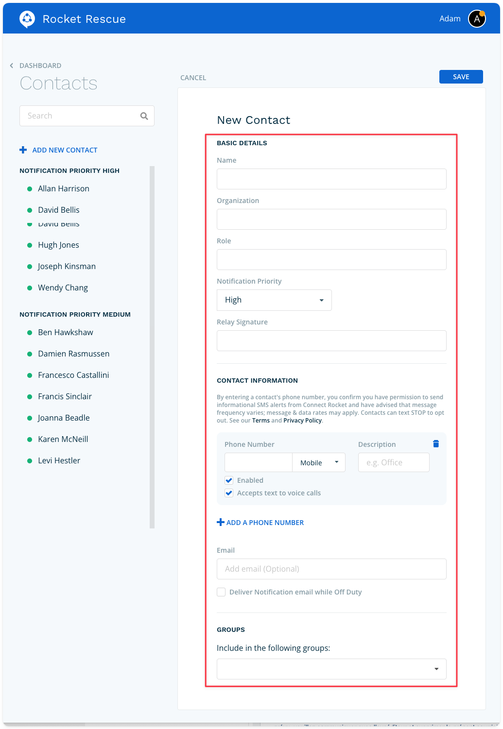 Add basic details and contact information for your contact. Using the select list, choose the group(s) you'd like to associate this contact with (you can do this later too). When done, click 'Save'.