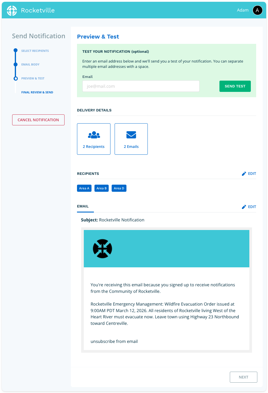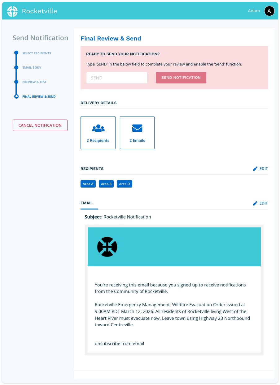 The Final Review page provides one last opportunity to verify your email. When everything is correct, type SEND in the confirmation field to enable the send function. Click Send Notification to deliver your email to all selected recipients.