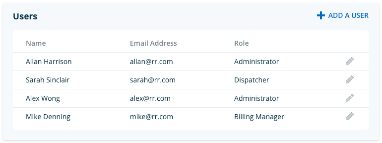 You can now view a list of your active users. The associated table shows the user's name, the email address that was used to create the user and the current role. Clicking the pencil icon will allow you to change a user's role or delete them from your account.