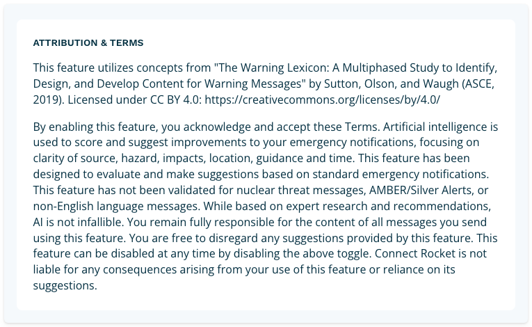 One enabled, Message Review configuration options will be revealed. The first block displays the Attribution & Terms. Please read this. If you do not agree with the Terms, please disable the feature.