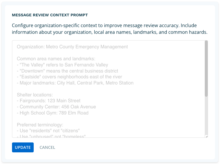 Information added here will provide organization-specific context that will improve message review accuracy. Include information about your organization, key contact details, preferred units of measurement etc. When done, click Update.