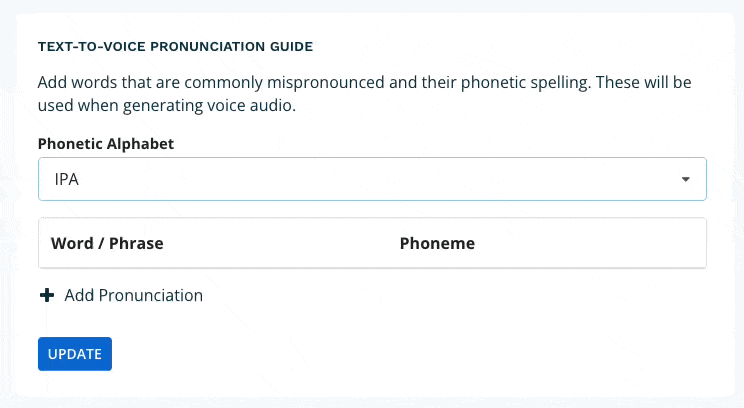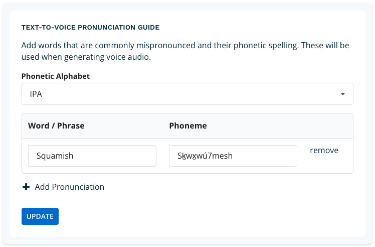 Next add the word or phrase and the associated phoneme that you wish to add a pronunciation guide. When done, you can add another word/phrase or click update.