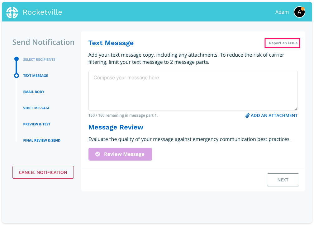 When finished drafting, click Review Message to evaluate your content against emergency communications best practices. The system will analyze your message and, if needed, suggest improved text that resolves any issues detected (such as unclear language or missing critical details).