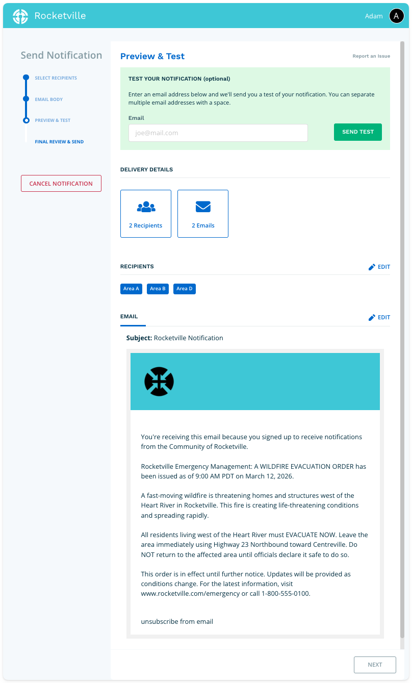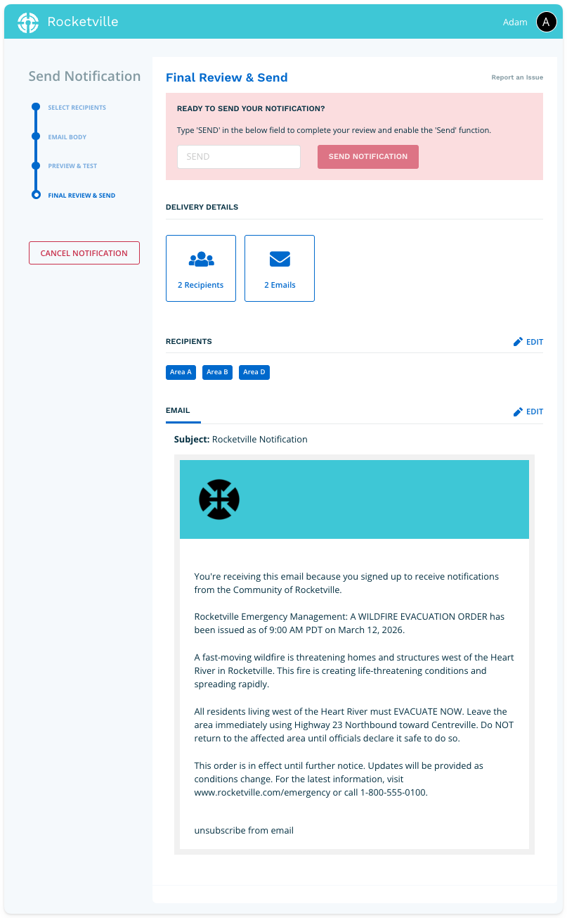 The Final Review page provides one last opportunity to verify your email. When everything is correct, type SEND in the confirmation field to enable the send function. Click Send Notification to deliver your email to all selected recipients.